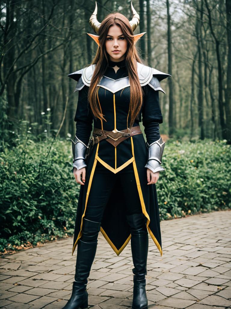 A woman dressed in an intricate fantasy-inspired costume stands confidently in a forest setting, featuring striking elven ears and horned headgear. Her outfit includes detailed armor pieces and a long, flowing cloak with gold accents, capturing a high-fantasy aesthetic reminiscent of popular game and anime styles like Arknights. The photo blends cosplay artistry with a natural backdrop, creating a dramatic and immersive scene.