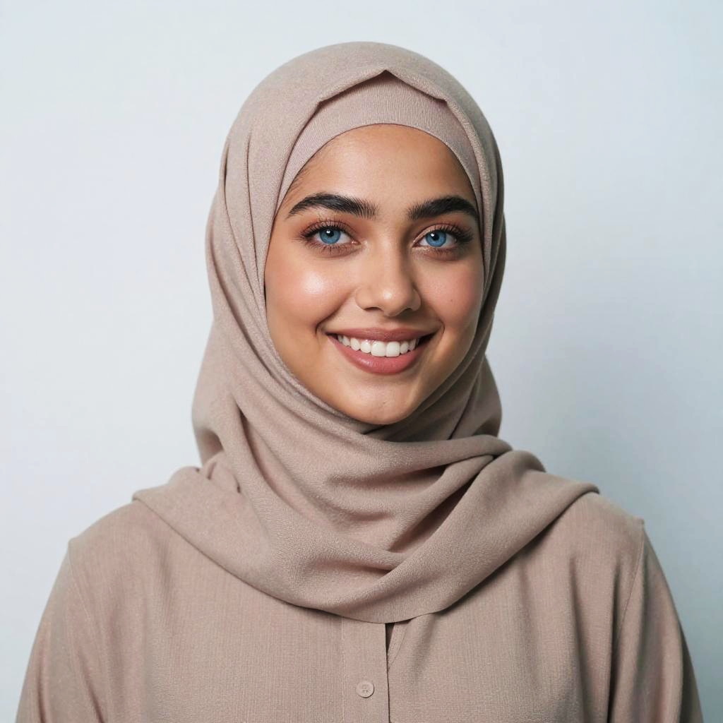A young woman wearing a beige hijab and matching top smiles warmly at the camera, showcasing her bright blue eyes and natural makeup. The minimalistic background and soft lighting highlight her serene expression and modern style, capturing the essence of Gen Z diversity and confidence.