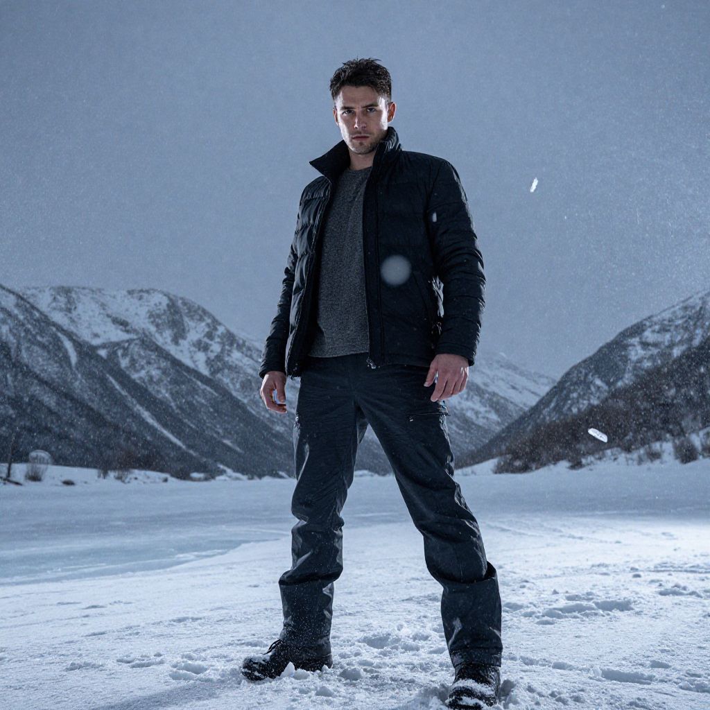 A confident man stands firmly in the middle of a snowy mountain landscape, dressed in a black jacket and dark pants suitable for cold weather. The dramatic winter setting is enhanced by falling snowflakes, with majestic snow-covered peaks framing the scene under an overcast sky.