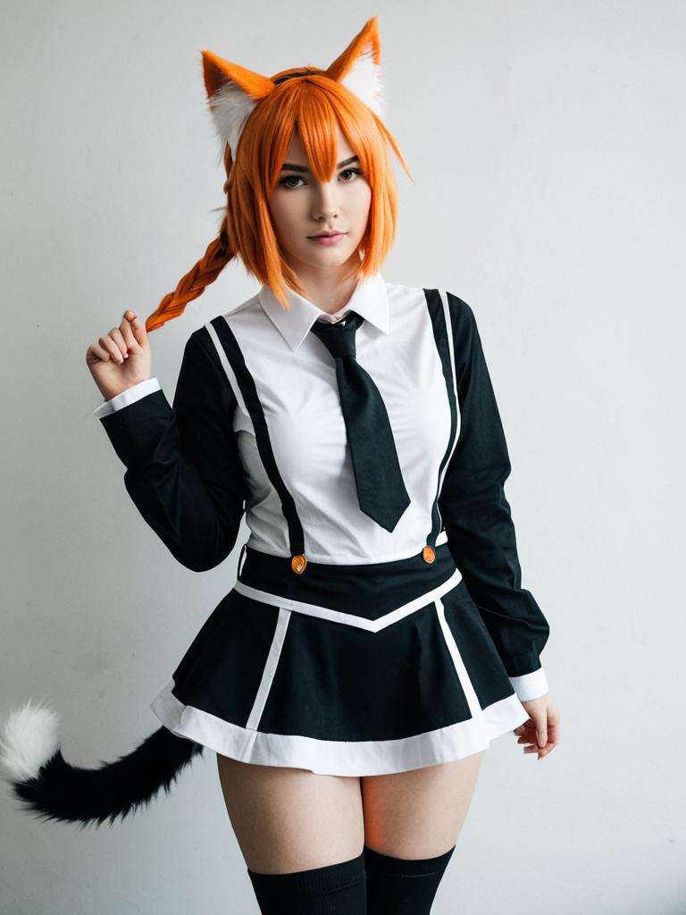 A woman dressed in a detailed Arknights-inspired cosplay features bright orange fox ears and a matching short wig, paired with a black and white school uniform-style outfit that includes a tie, suspenders, and a pleated skirt. The style reflects a high-quality anime cosplay with accurate character details, set against a plain background to emphasize the costume and character design.