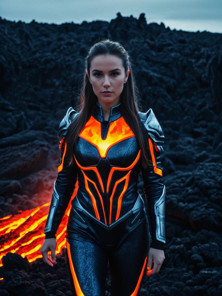 A confident woman stands outdoors in a futuristic lava-themed costume that glows with bright orange and yellow accents, resembling molten lava. The photorealistic portrait captures the intense contrast between her high-tech outfit and the rugged dark volcanic landscape surrounding her.