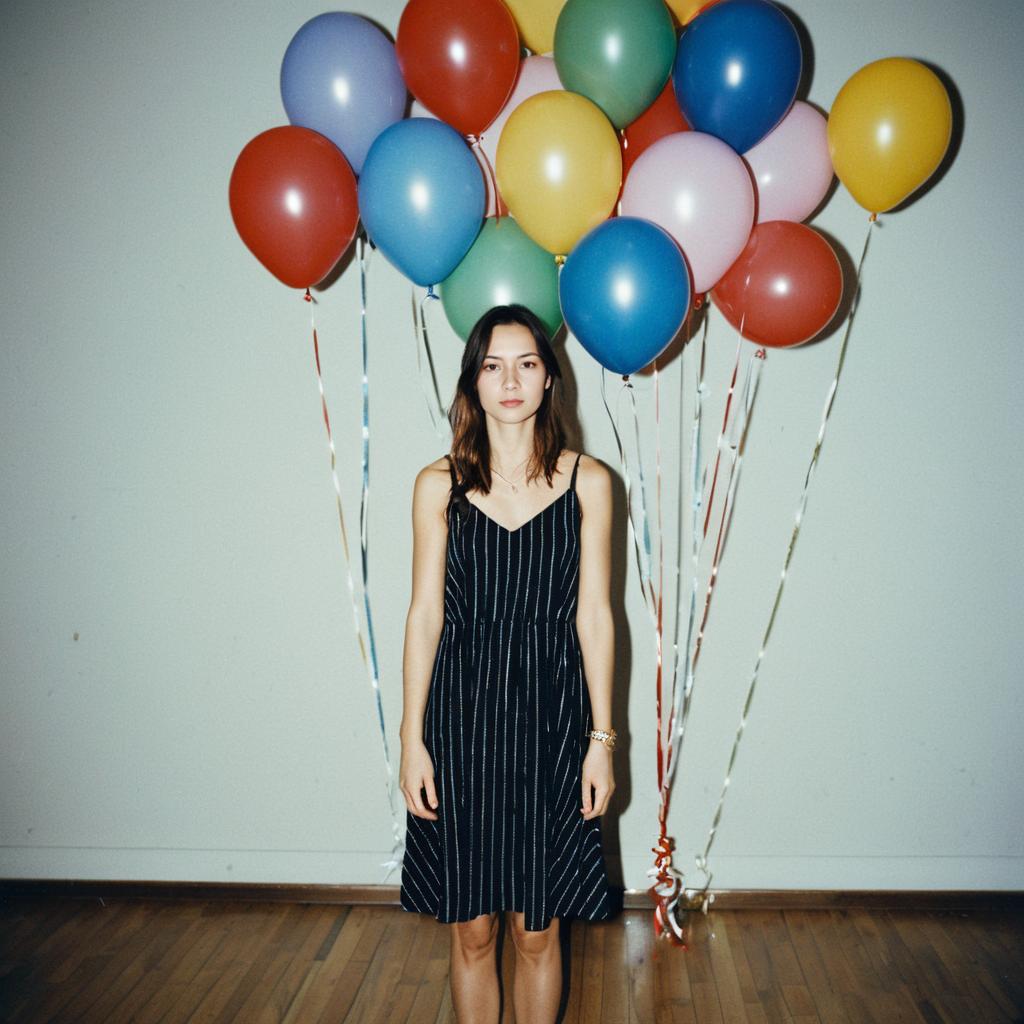 A woman stands in front of a bunch of colorful helium balloons, wearing a stylish black birthday slip dress with thin straps and subtle vertical stripes. The minimalist setting with wooden flooring and plain walls highlights the festive yet elegant mood of the image.