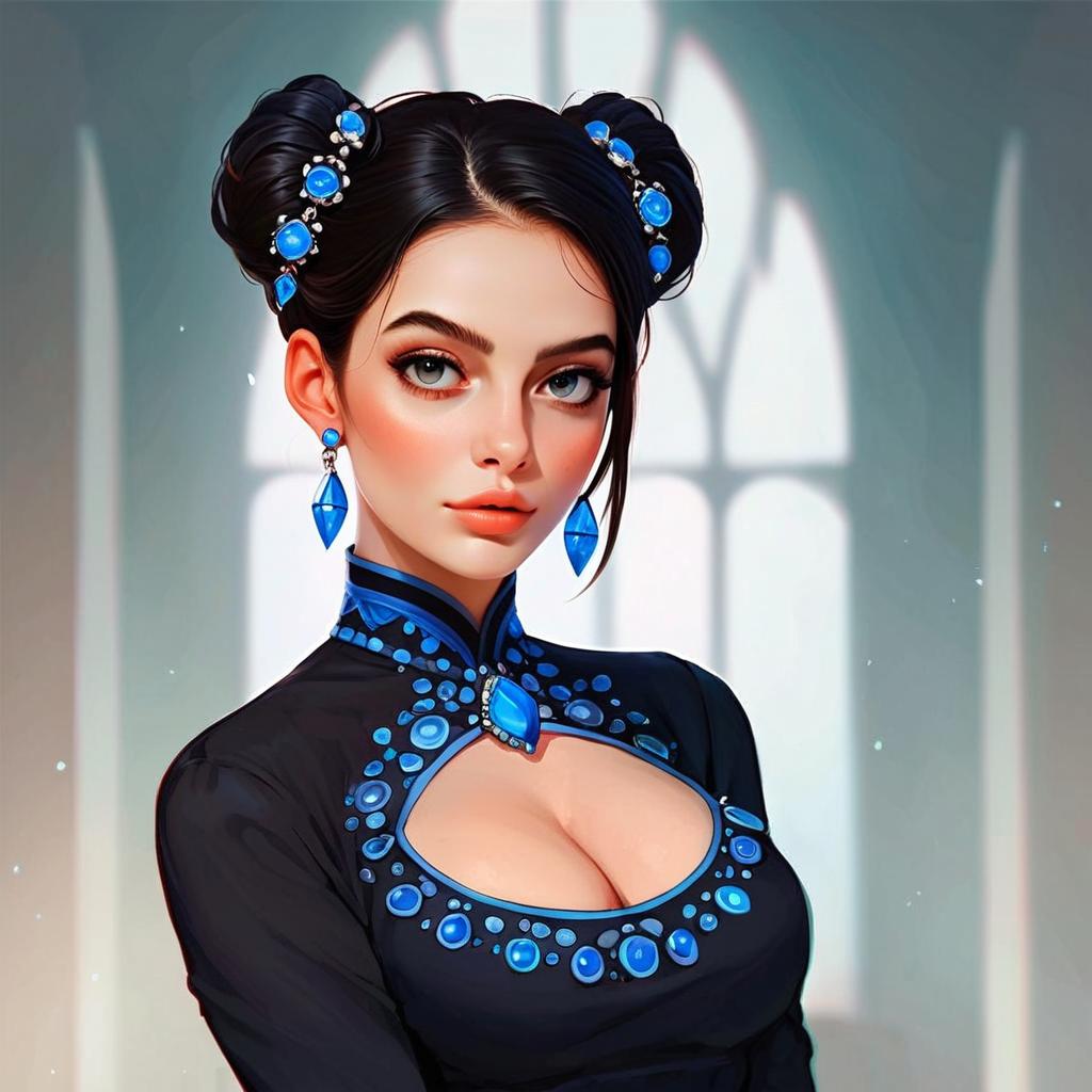 This digital artwork features a woman with strikingly detailed facial features, styled hair in two buns adorned with blue jewels, and matching blue earrings. She wears a black garment decorated with an array of blue gemstones around a heart-shaped neckline, blending elegance with a modern fantasy style. The soft, blurred background emphasizes her vivid appearance, highlighting the intricate detailing and vibrant color contrast of the portrait.