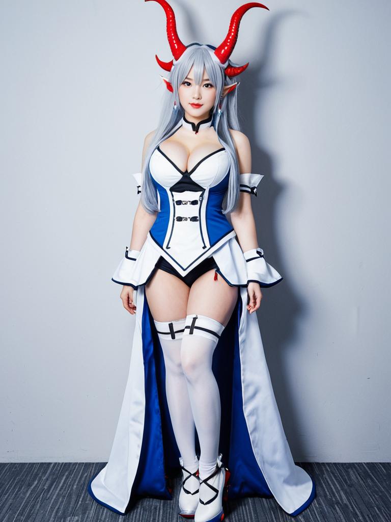 Hakuryuu Azur Lane Cosplay Woman in Blue and White Costume with Red Horns
