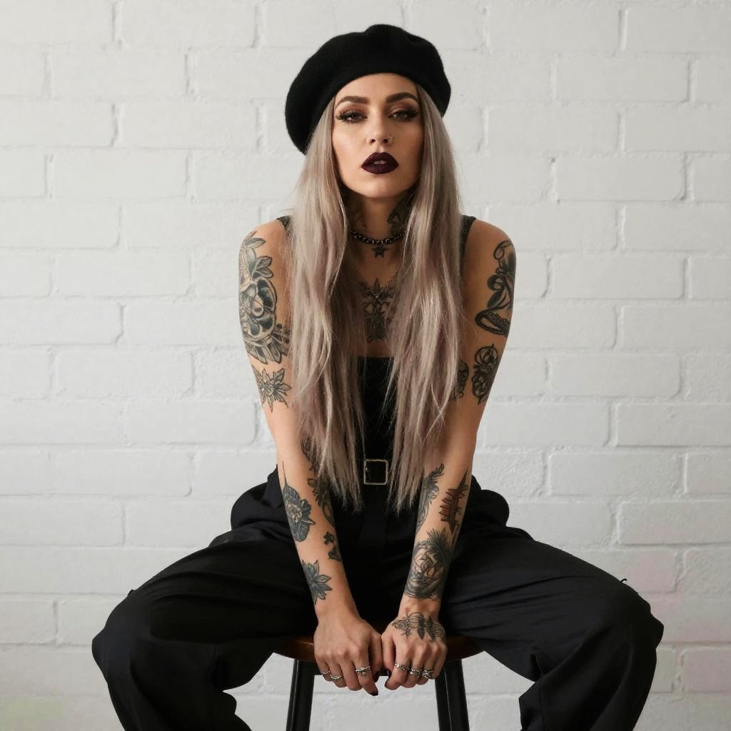 Tattooed Woman in Black Beret and Urban Fashion Sitting on Stool