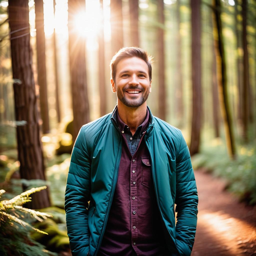 A cheerful man wearing a teal jacket and maroon shirt smiles warmly while standing on a sunlit forest trail. The golden sunlight filters through tall trees, creating a serene and inviting atmosphere in the natural surroundings.