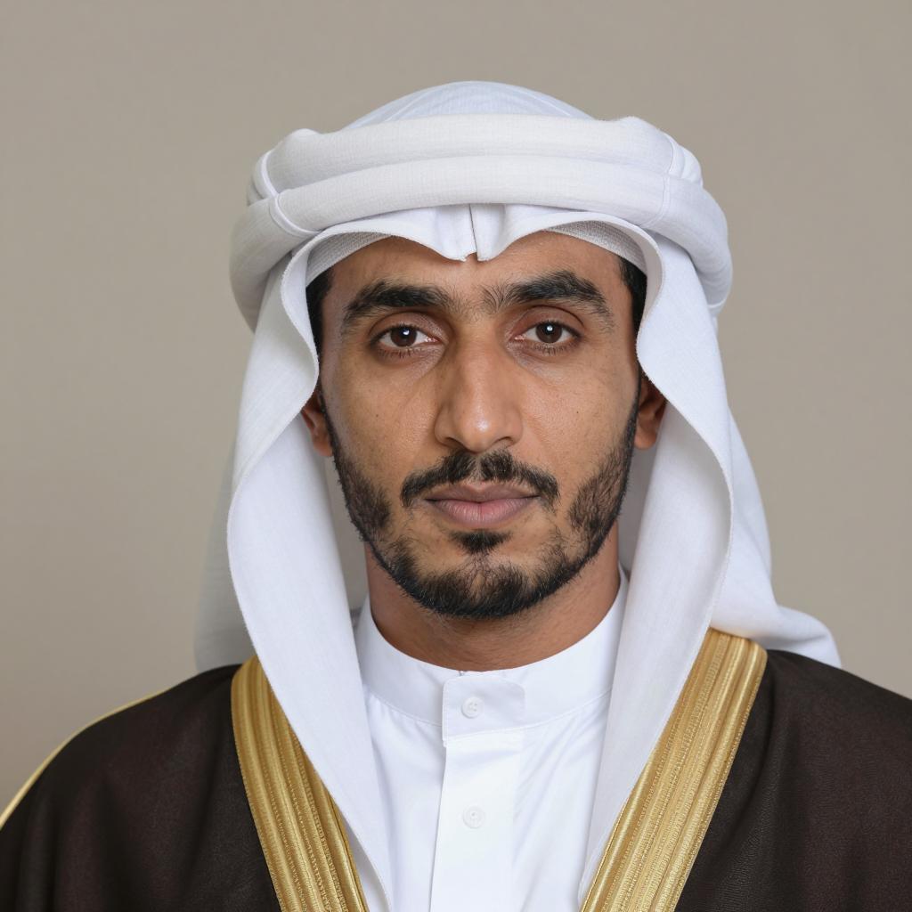 A close-up portrait of a man dressed in traditional Middle Eastern attire, including a white keffiyeh and a dark brown bisht with gold embroidery. The neutral background emphasizes his calm and solemn expression, highlighting cultural heritage and formal dress.