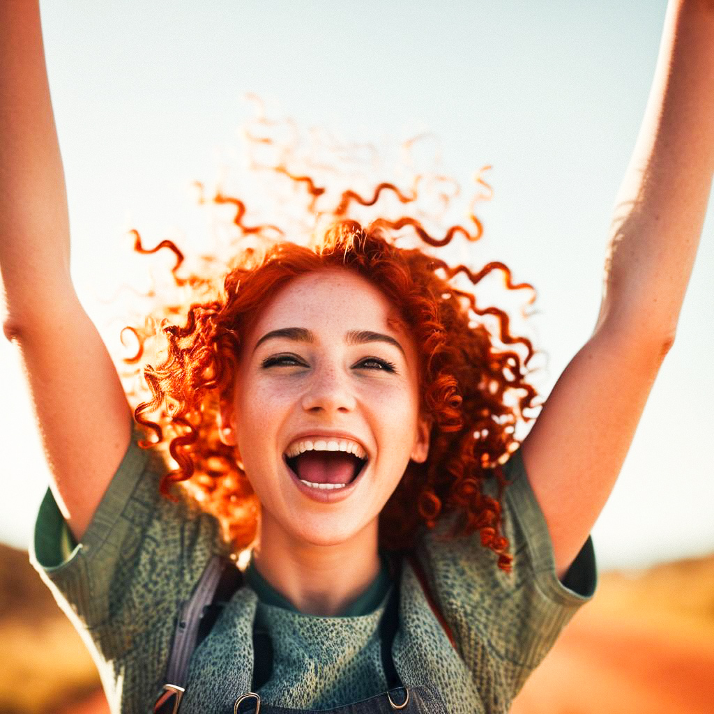 A joyful woman with curly hair stands outdoors in a scenic field during golden hour, reaching her arms forward as she smiles warmly at the camera. The soft sunlight highlights her hair and creates a vibrant, natural atmosphere with rolling hills in the background.