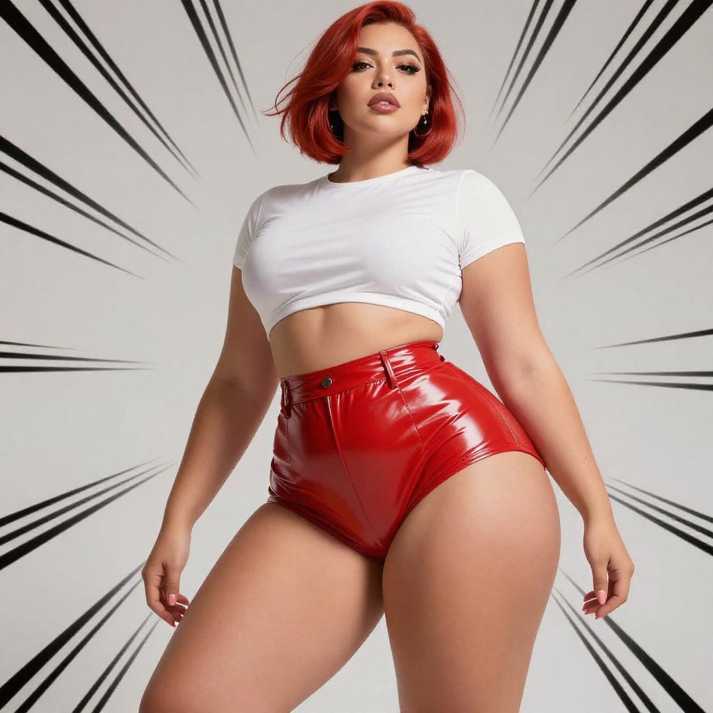A confident woman with vibrant red hair poses in a modern, edgy fashion style, wearing a white cropped top paired with shiny red high-waisted shorts. The dynamic background featuring comic-style black speed lines adds a bold and energetic pop art influence to the composition.