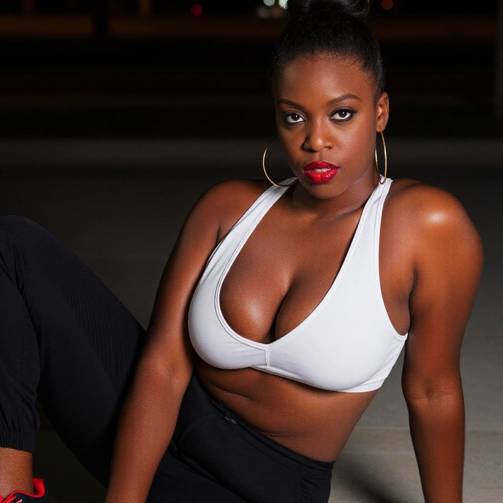 A confident woman dressed in a white sports bra and black pants poses sitting on the ground in a nighttime urban setting. She sports bold red lipstick, gold hoop earrings, and an athletic yet glamorous look that combines fitness and fashion.