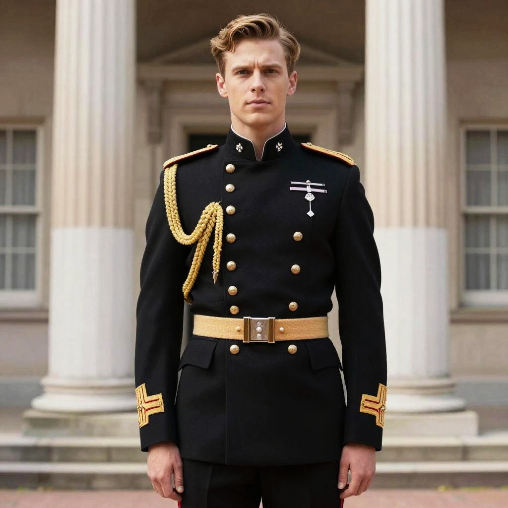 A man dressed in a formal Prince Phillip style military uniform stands solemnly in front of classical architectural columns. The uniform features gold buttons, intricate gold embroidery, and a ceremonial cord, reflecting a traditional and regal military style.