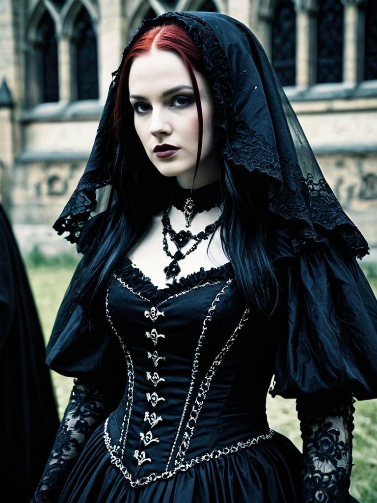 A woman dressed in an elegant black gothic gown featuring intricate lace details and silver accents poses in front of a gothic cathedral backdrop. Her striking red hair and dark accessories perfectly embody the gothic fashion style often celebrated at festivals and events.