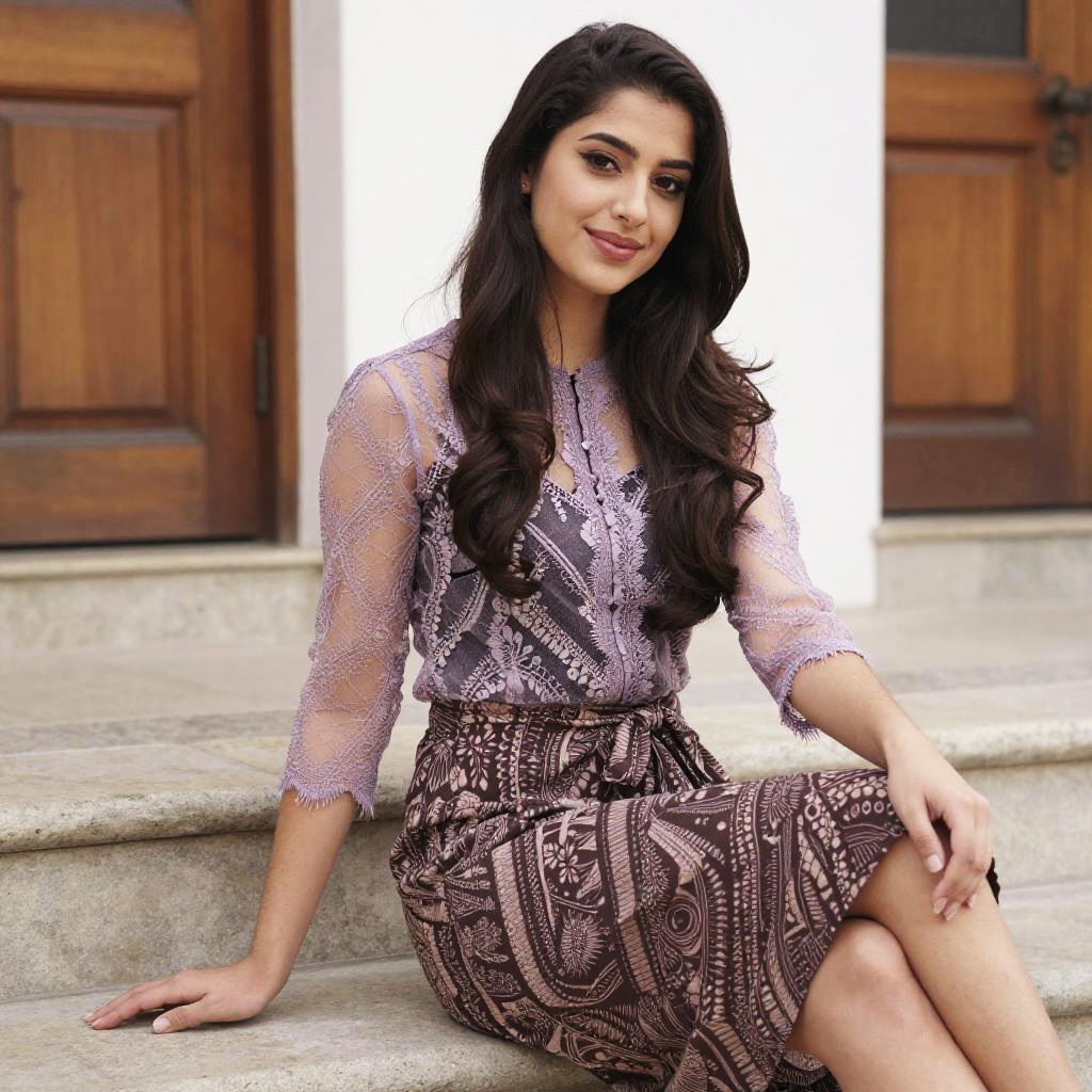 A woman with long dark hair sits gracefully on stone steps, wearing a delicate lavender lace top paired with a patterned brown skirt tied at the waist. Her softly curled hair and confident smile complement the elegant and sophisticated style of her outfit, set against a backdrop of wooden doors and a white wall.