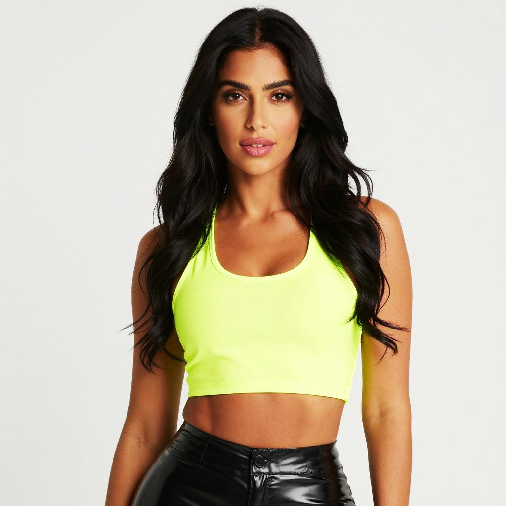 A confident woman poses against a plain light background, wearing a vibrant neon yellow crop top paired with shiny black high-waisted pants. Her long, wavy black hair and poised expression highlight a modern and bold fashion style with a clean and minimalistic studio portrait composition.