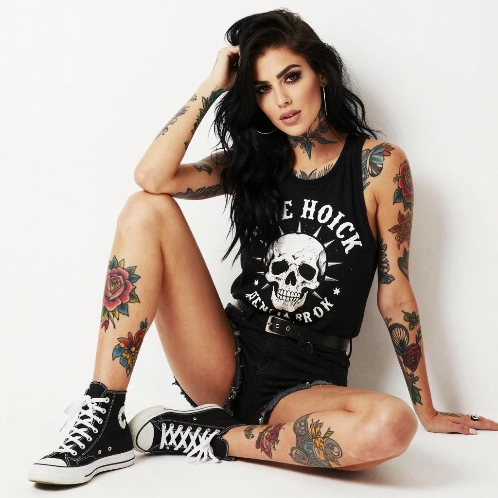 A tattooed woman with long black hair poses confidently against a plain white background, dressed in a black tank top featuring a skull graphic and black denim shorts. Her vibrant tattoos and edgy streetwear style, complemented by classic black high-top sneakers, create a bold and modern look.