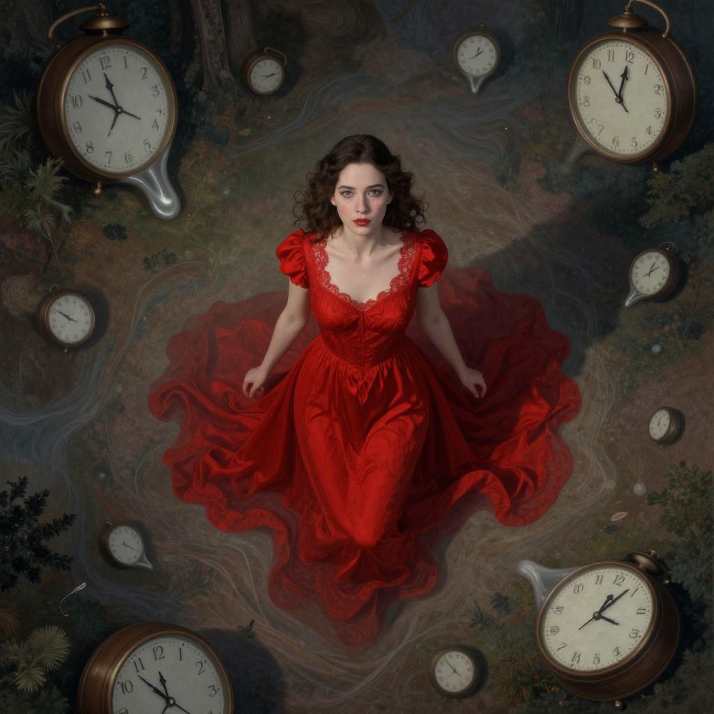 A woman in a flowing red dress stands at the center of a surreal scene surrounded by numerous melting and distorted clocks suspended in a dreamlike landscape. The image blends elements of fantasy and surrealism, evoking a sense of distorted time and ethereal atmosphere.