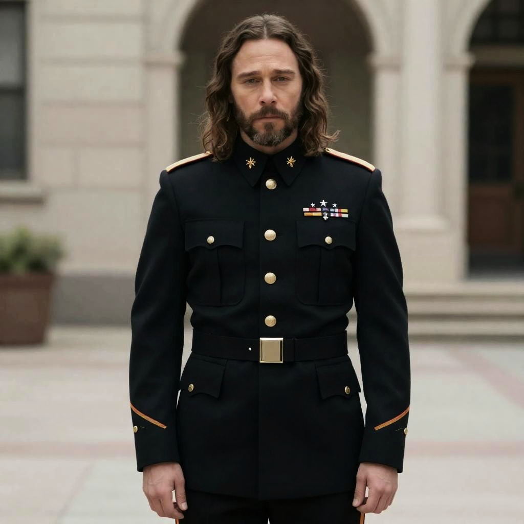 A man with shoulder-length hair and a beard stands solemnly in a formal military uniform adorned with medals and insignias. The backdrop is a courtyard with classical stone architecture, lending an air of historical or ceremonial significance to the portrait.