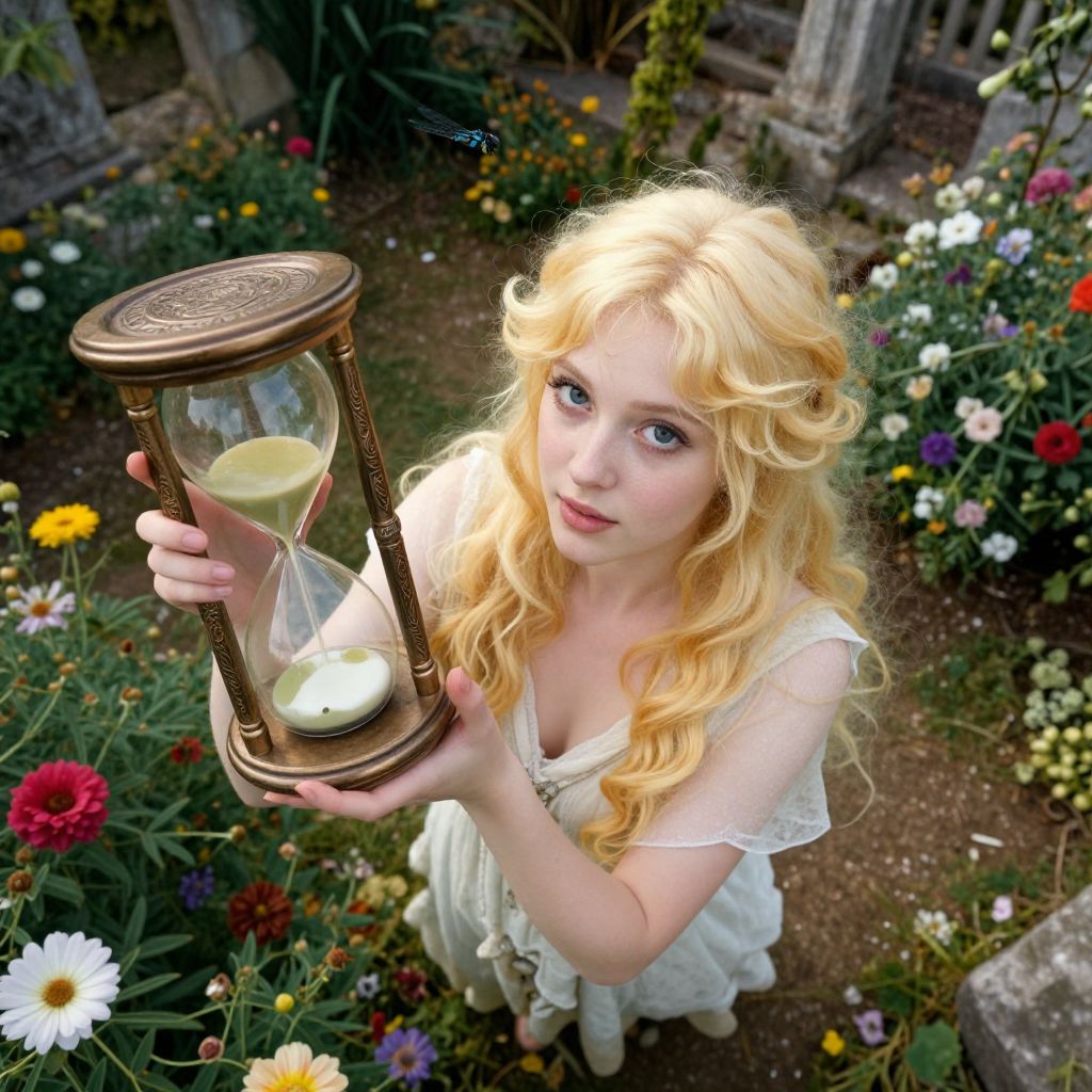 A young woman with long blonde hair and a delicate white dress stands amidst a vibrant flower garden, holding an ornate hourglass filled with sand. The scene captures a mystical, timeless atmosphere with soft natural light and a serene expression on her face.