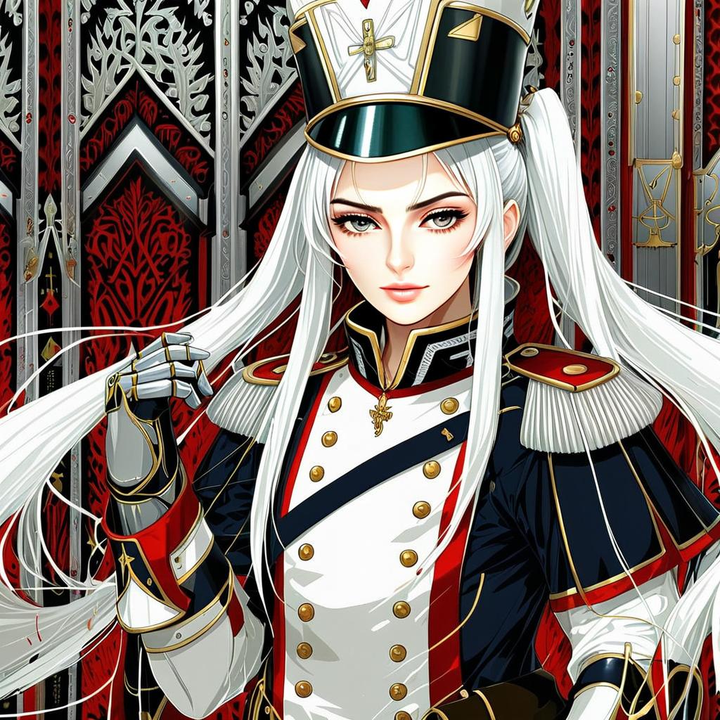 This detailed anime-style illustration features a confident woman dressed in an elaborate military uniform with gold buttons and accents, including epaulets and a tall hat adorned with a cross emblem. Her long white hair flows elegantly, contrasting with the ornate red and silver background, conveying a powerful and commanding presence. The artwork blends classical military design with modern anime aesthetics, showcasing intricate line work and vibrant color contrasts.