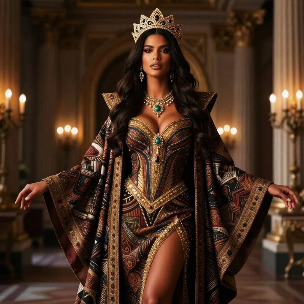 A regal woman dressed in an intricately designed gown with gold embellishments and jewel accents poses confidently in an opulent palace setting. Her crown and luxurious cape emphasize a majestic, queen-like style, blending modern elegance with classical royal aesthetics.