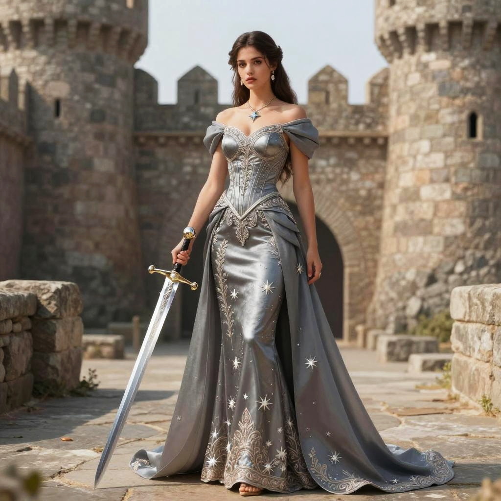 A regal woman stands confidently in front of a stone castle, wearing an ornate silver medieval-inspired gown adorned with intricate embroidery and star motifs. She holds a large, elegant sword, embodying strength and grace with a powerful, fantasy-themed aesthetic.