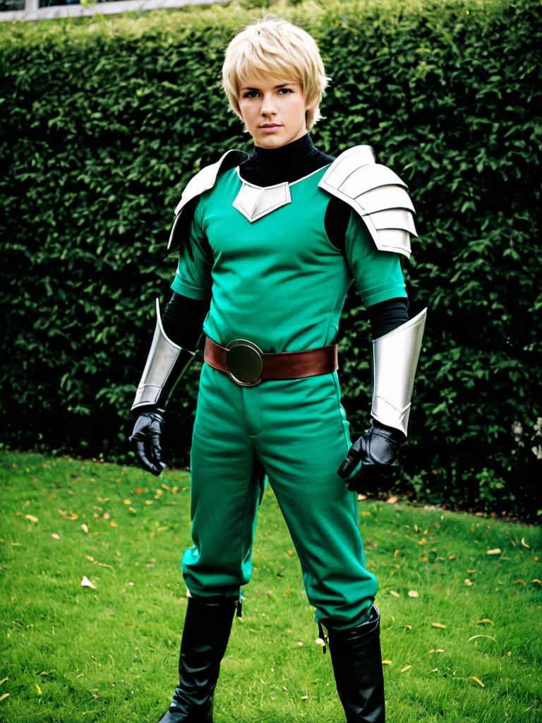 A young man dressed in a vibrant green costume with silver armor shoulder plates and gauntlets stands confidently on a grassy lawn. The outfit, accented with black gloves and boots, gives off a medieval or fantasy warrior vibe, enhanced by his focused expression and short blonde hair.