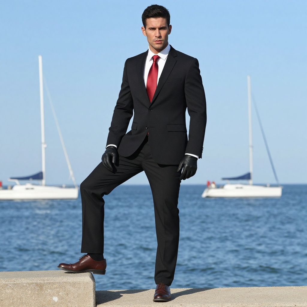 A confident man in a sharp black suit with a red tie and black leather gloves poses by the waterfront, set against a clear blue sky and calm sea. Sailing boats float gently in the background, adding a serene maritime atmosphere to this stylish and professional outdoor portrait.