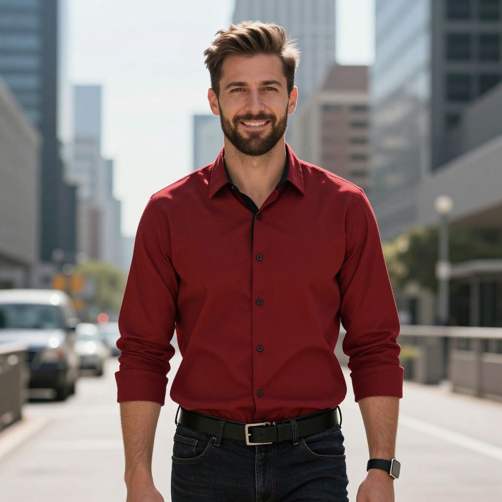 A confident man with a beard is walking outdoors in an urban setting, dressed in a stylish red button-up shirt and dark jeans. The background features modern office buildings and a blurred street scene, highlighting a casual yet professional look.