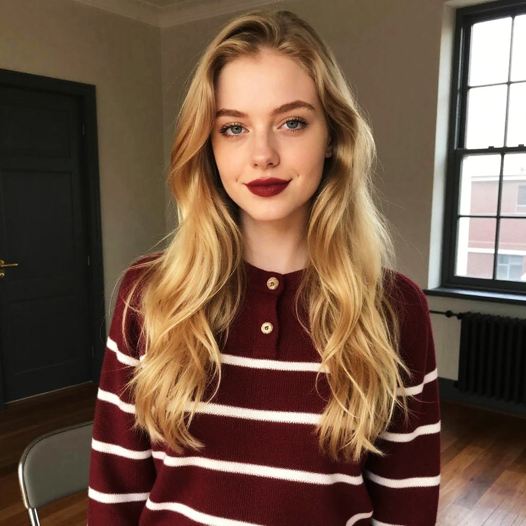 A young woman with long blonde hair and striking blue eyes is seated indoors, wearing a maroon sweater with white horizontal stripes and gold buttons. The natural light from a large window illuminates her face, highlighting her confident expression and subtle makeup featuring deep red lipstick.