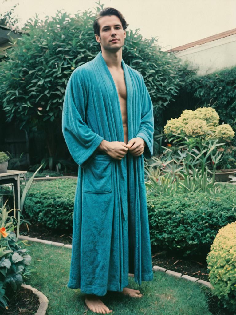 A man stands barefoot in a lush garden wearing an extra-long blue robe that drapes elegantly down to his feet. The robe's soft fabric and relaxed fit give off a casual, comfortable vibe as he gazes thoughtfully into the distance.