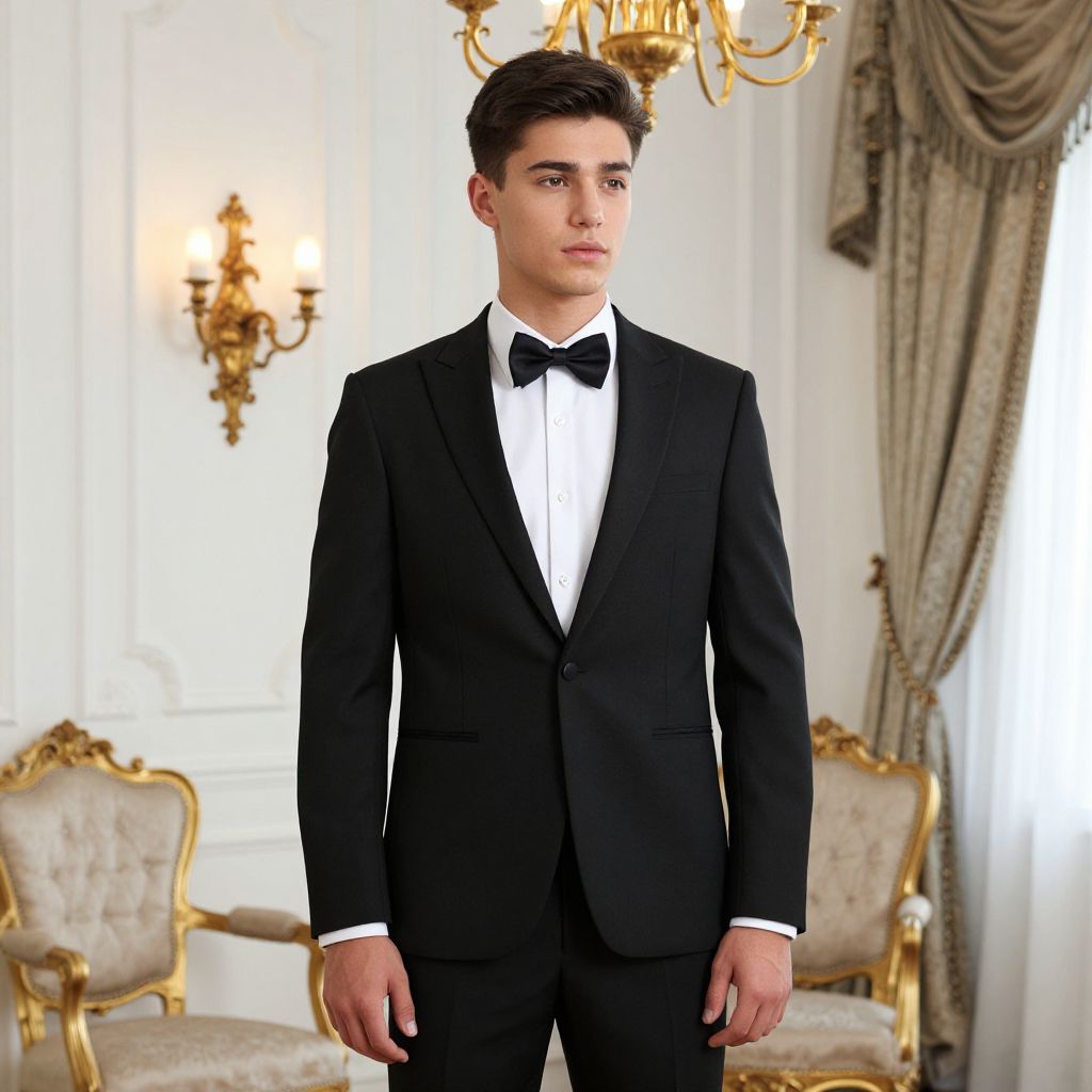A young man dressed in a classic black tuxedo with a bow tie stands poised in an opulent, elegantly furnished room featuring gold-accented furniture and ornate wall sconces. The sophisticated setting highlights a traditional formal style, emphasizing refinement and timeless fashion for special occasions.