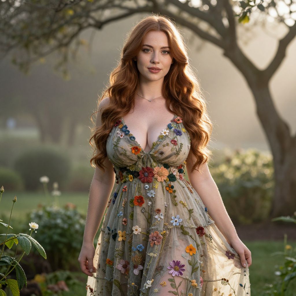 A red-haired woman stands gracefully in a sunlit garden, wearing a sheer dress adorned with colorful embroidered flowers. The soft background and natural lighting emphasize the delicate details and serene atmosphere of the outdoor setting.