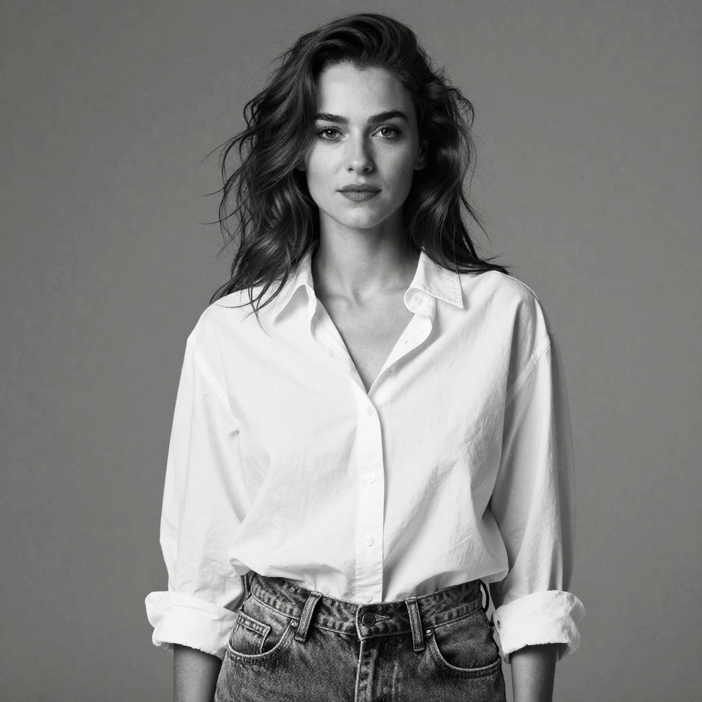 A confident young woman embodies the effortless style of Generation Z with her relaxed white button-up shirt and casual denim jeans. The black and white portrait captures her natural beauty and modern, minimalistic fashion sense.