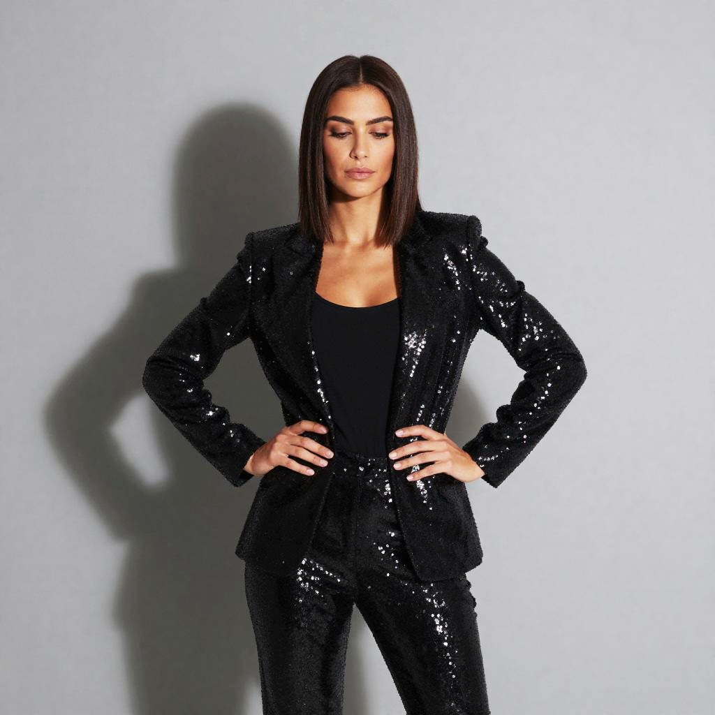 A confident woman dressed in a black sequined suit poses against a neutral gray background. The outfit is stylish and modern, reflecting contemporary fashion trends often favored by Gen Z for its bold and glamorous appeal.