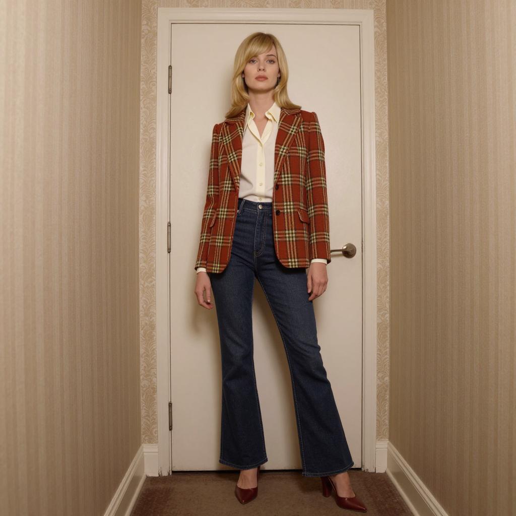 A woman stands confidently in a narrow, vintage-style hallway wearing a retro-inspired outfit featuring a red plaid blazer, a cream blouse, high-waisted flared jeans, and burgundy heels. The overall look reflects a stylish 1970s fashion revival with modern tailoring and a composed expression.