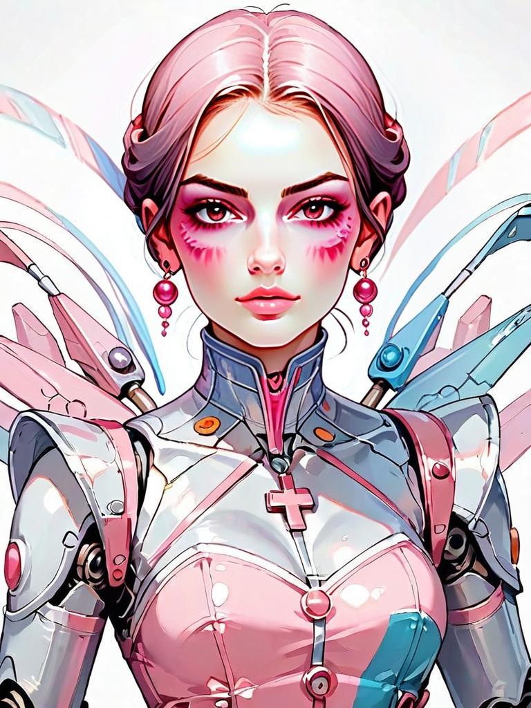 This striking digital artwork features a woman with a realistic face wearing a modern ball gown blended with an asymmetrical silhouette and futuristic armor elements. The character's high-tech, robotic wings and metallic attire combine modern sci-fi aesthetics with elegant fashion, illustrated in a polished, vibrant style.