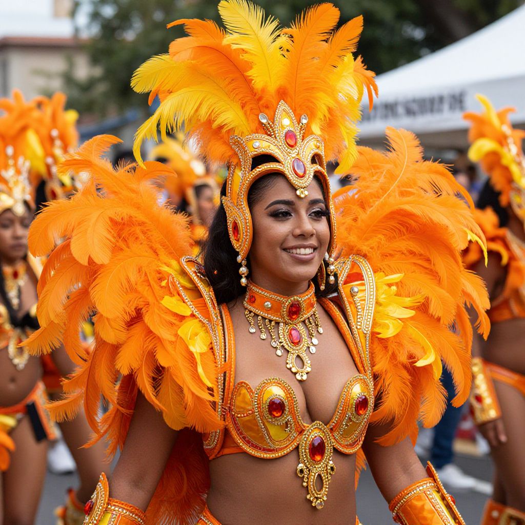 A woman dressed in a vibrant orange carnival costume adorned with large feathers and sparkling jewels smiles as she participates in a lively parade. Her elaborate headpiece and detailed accessories reflect traditional carnival style, showcasing festive cultural celebration and joyful spirit.
