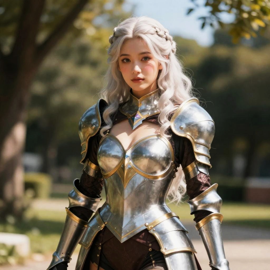 A woman stands outdoors dressed in a detailed, shiny silver and gold medieval-style armor with intricate shoulder and arm guards. Her long, platinum blonde hair is styled in loose waves with a braid crown, evoking a fantasy or cosplay aesthetic reminiscent of a warrior princess or a character from a medieval fantasy setting.