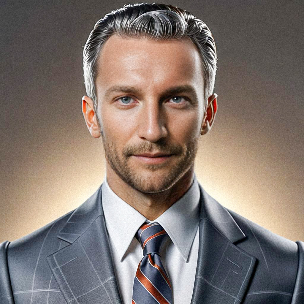 This polished portrait features a confident man in a tailored suit, exuding professionalism and charisma. The composition highlights his sharp features and well-groomed appearance, set against a softly lit background that enhances the subject's presence.