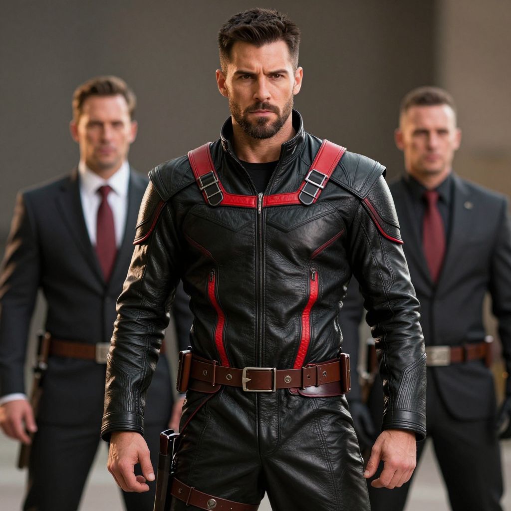 Man in Black Leather Jacket with Red Accents and Suit-Clad Bodyguards