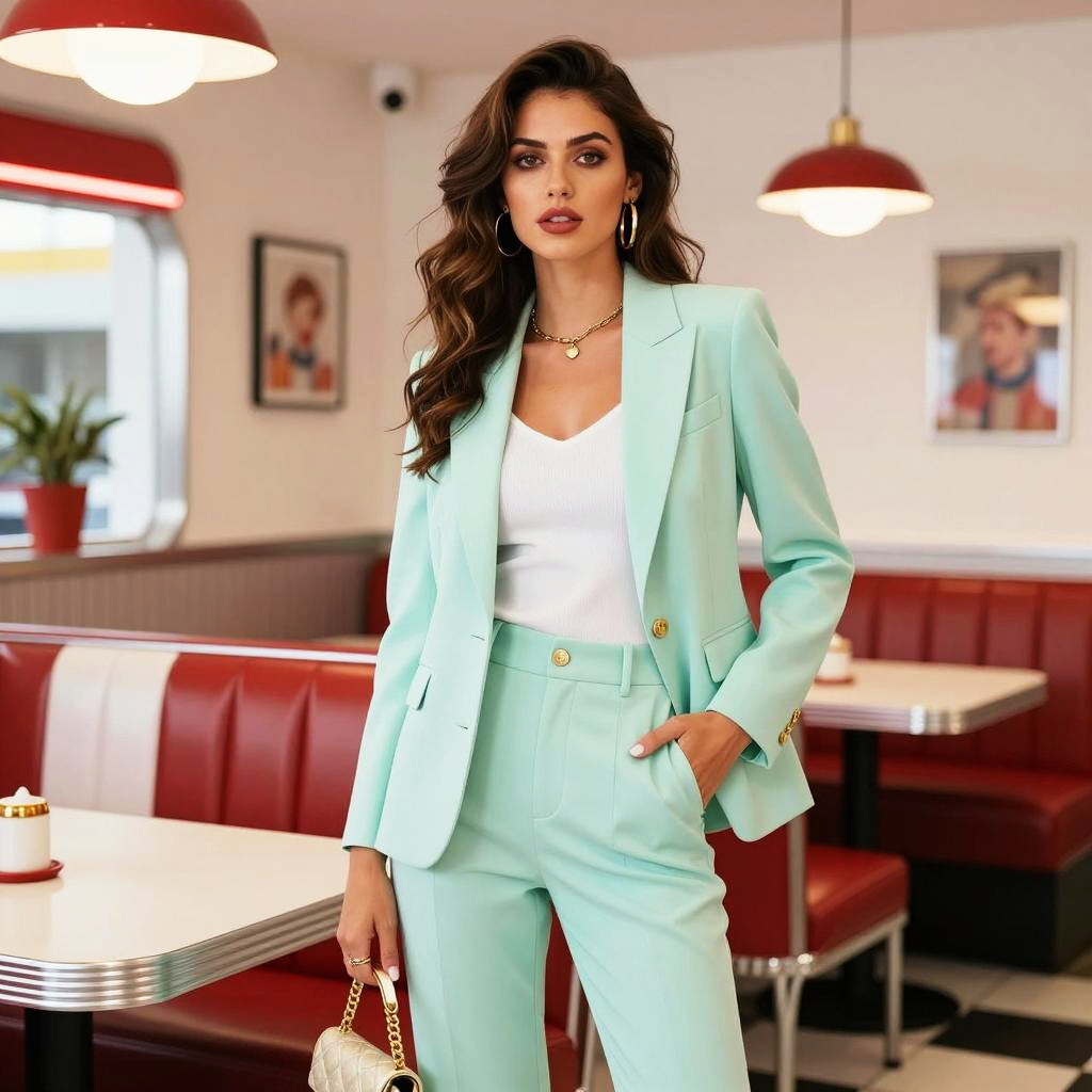 A confident woman poses in a stylish mint green pantsuit paired with a white top, exuding modern elegance. She stands in a retro diner setting with red booths and classic decor, creating a chic contrast between contemporary fashion and vintage ambiance.