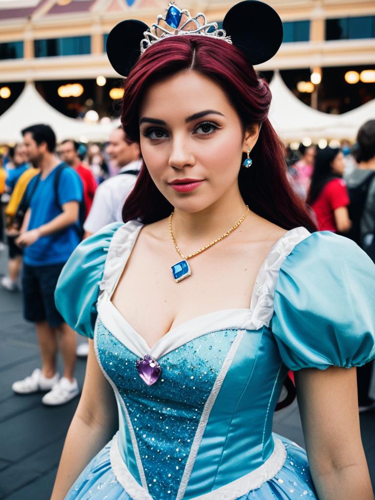 A woman dressed in a sparkling blue Disney princess dress with puffed sleeves and jeweled accessories poses at a cosplay festival. She wears a tiara with Mickey Mouse ears, blending classic princess style with Disney theme park culture in this vibrant portrait.