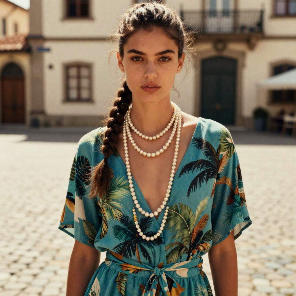 A young woman with a long braided hairstyle stands confidently in a sunlit courtyard wearing a vibrant tropical print dress. She accessorizes with layered pearl necklaces, adding elegance to her casual, summery look.