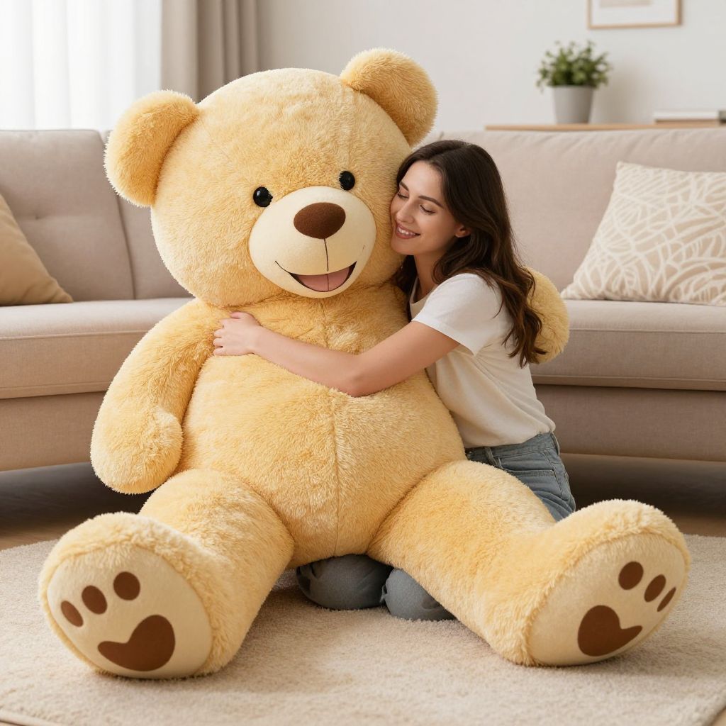 Young Woman Hugging Giant Plush Teddy Bear in Cozy Living Room