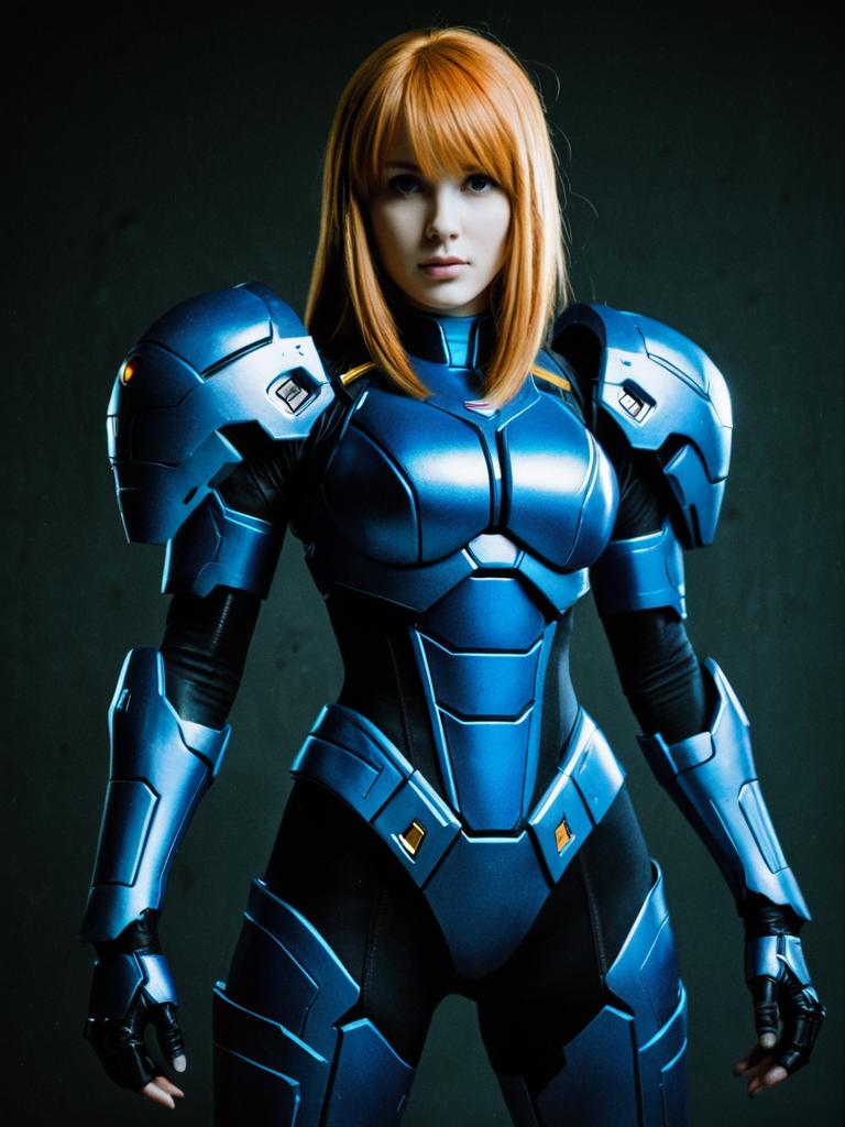 A woman wearing a highly detailed, realistic Dark Samus-style cosplay armor stands confidently against a dark background. The blue metallic suit features intricate plating and futuristic design elements, complemented by her vibrant orange hair and intense gaze, capturing the iconic video game character's essence.