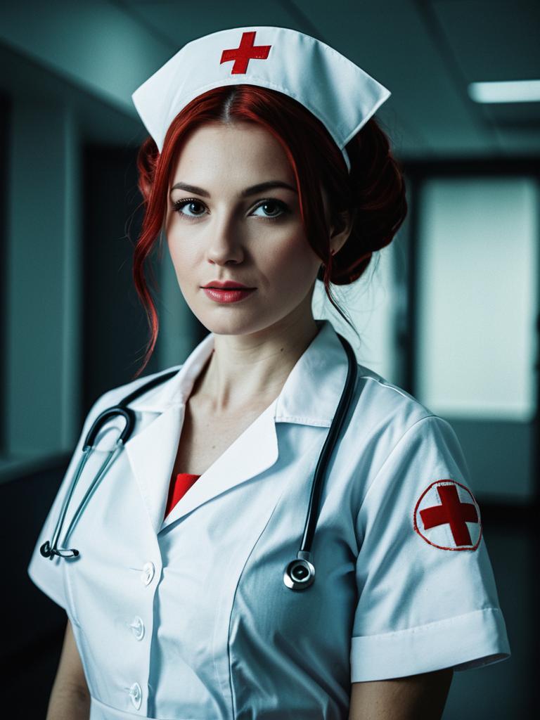 A photorealistic professional cosplay portrait of a woman dressed in a classic nurse costume with a white cap featuring a red cross and a white uniform adorned with a red cross patch on the sleeve. She has red hair styled elegantly and wears a stethoscope around her neck, set against a softly blurred indoor background.