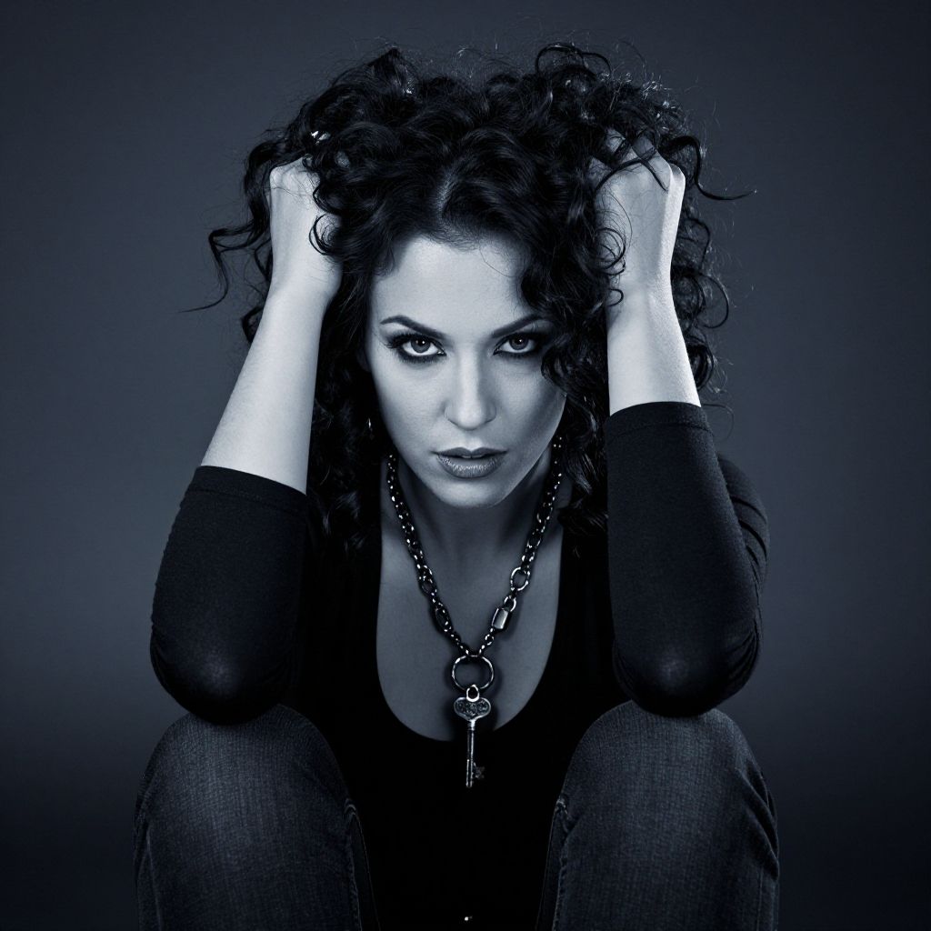 Moody Portrait of Woman with Curly Hair and Key Necklace