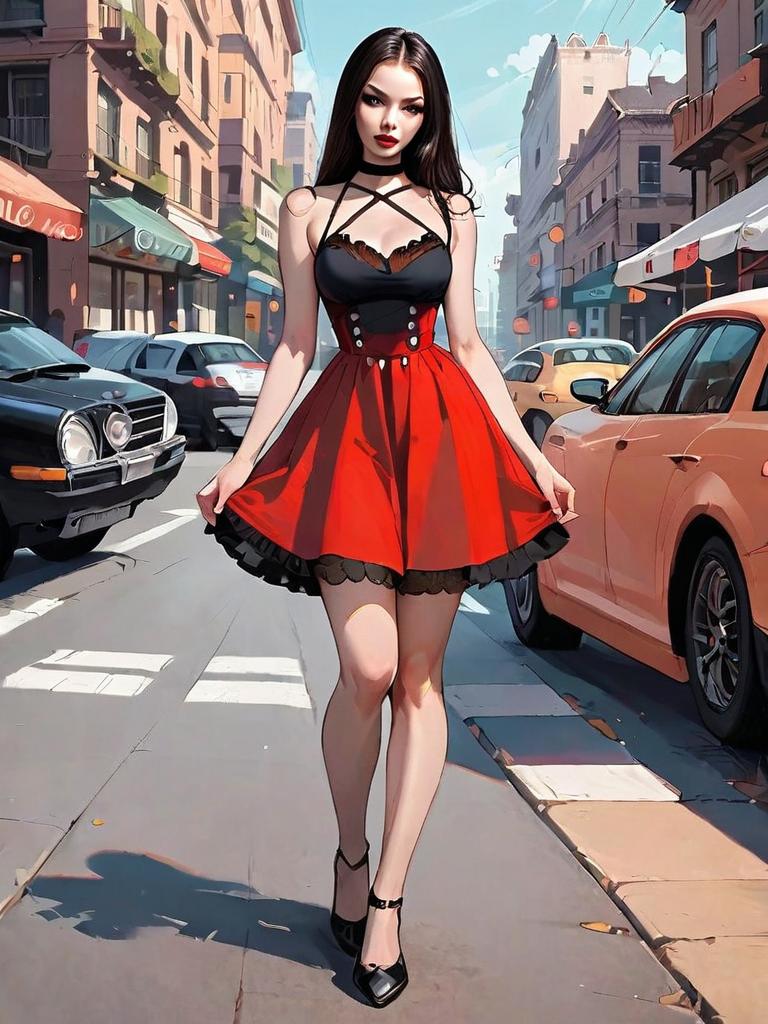 A stylish young woman walks confidently down a city street, wearing a striking black and red dress with a fitted bodice and flared skirt. The realistic digital artwork captures intricate details in her outfit and surroundings, combining modern fashion with a polished comic-style illustration.