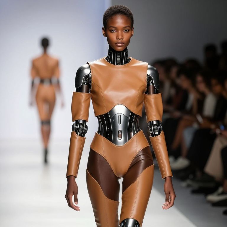A confident woman walks the runway wearing a futuristic leather and metallic bodysuit that merges fashion with robotics. The outfit showcases a sleek avant-garde style with robotic elements integrated into the design, highlighting a bold blend of technology and high fashion.