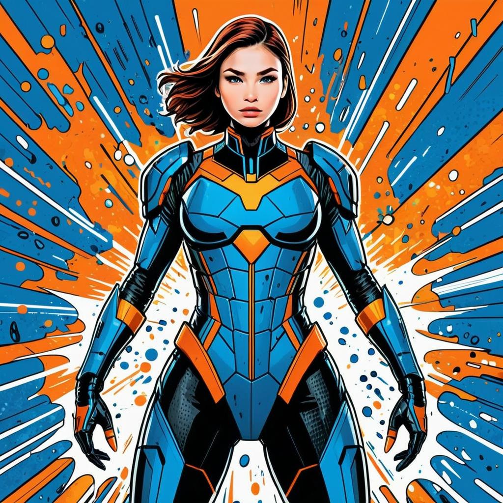 This vibrant digital illustration features a confident woman clad in a futuristic blue and orange armored suit, exuding strength and determination. The dynamic background with explosive brush strokes enhances the action-packed, comic book style that defines this modern superhero artwork.